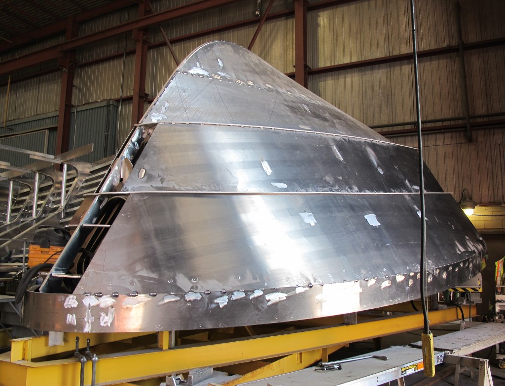 Photo showing SAR hull construction. The bow section on the right is constructed upside-down and then flipped and joined to mid-ship and stern.